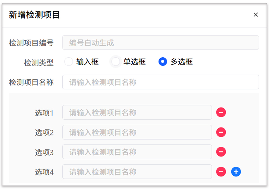 根据产品质检需求,创建检验项目(支持单选/多选,可自定义N条内容)