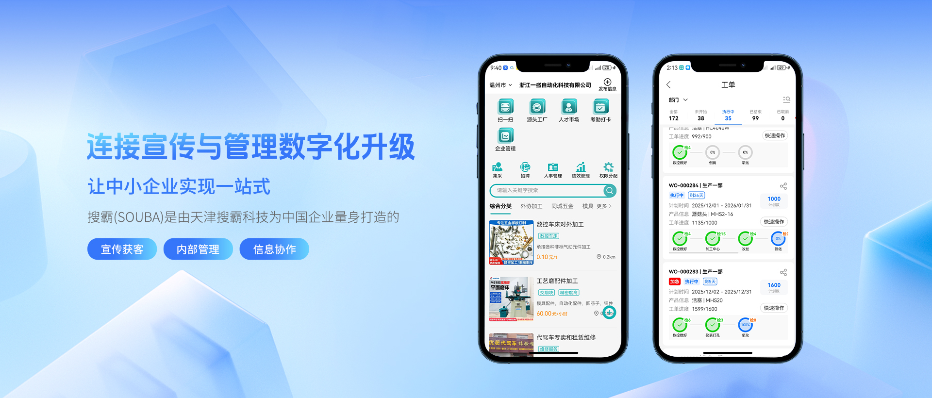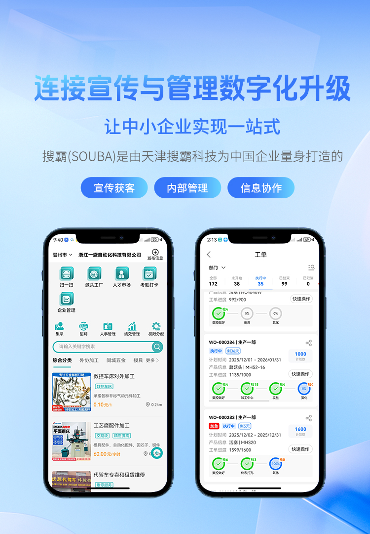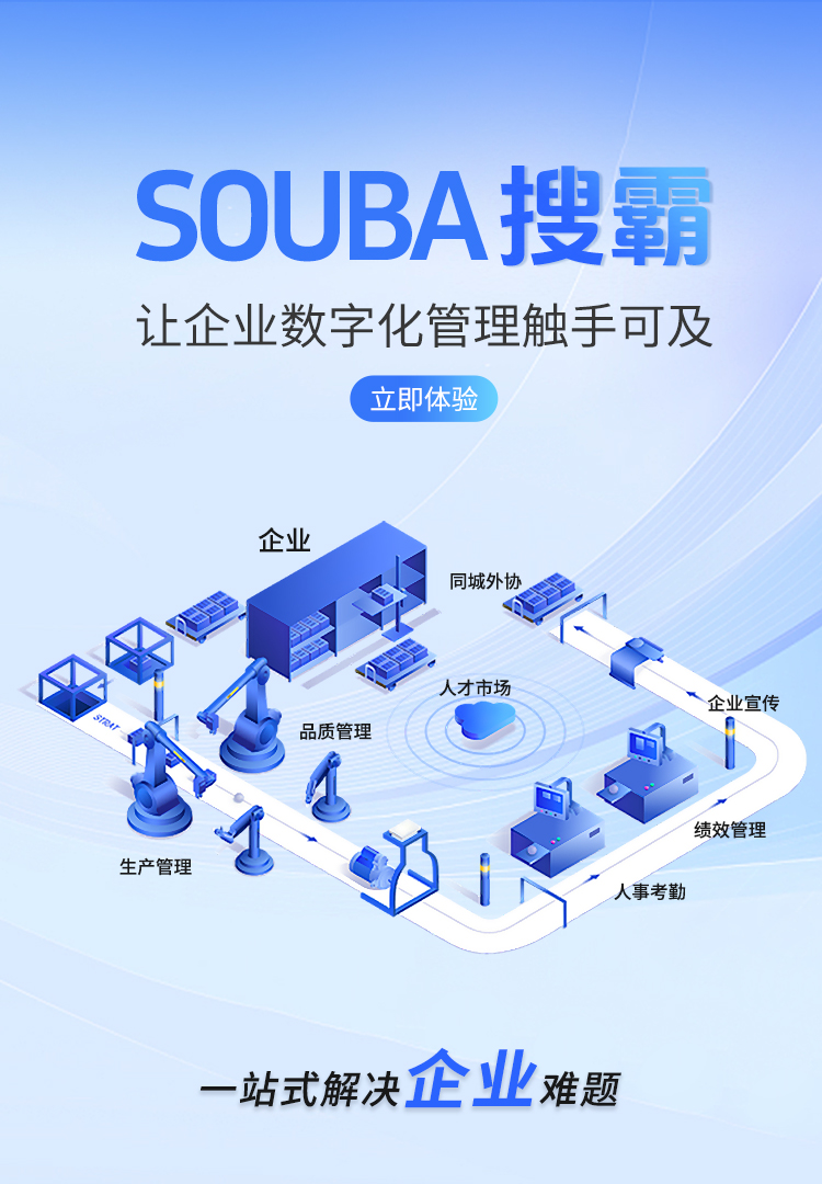 搜霸(SOUBA) 是由天津搜霸科技为中国企业量身打造的 一站式企业数字化管理与沟通平台。 平台以 即时通讯 + 企业ERP + 招聘 + 同城服务 + 源头工厂展示 + 企业社区 为核心模块,旨在帮助中小微企业以最低的成本完成从 宣传获客 → 内部管理 → 信息协作 的全面数字化升级。